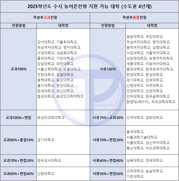 농어촌학생전형 서울 · 인천 · 경기(수도권) 리스트입니다.